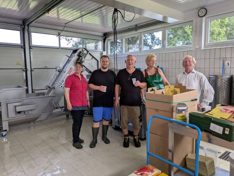 Artland-Mosterei produzierte aus einem Teil der Ernte mit ihrer neuen Technik etwa 400 Liter wunderbaren Apfelsaft aus unseren ungespritzten Äpfeln. Wir sind glücklich, nicht die über 20 mal gespritzten Äpfel aus konventionellem Anbau verwenden zu müssen.