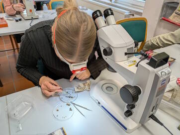 UNESCO Geopark Terra vita standen die Funde von Zähnen eines Urzeitpferdes, das im Osnabrücker Nordland sein nördlichstes bekanntes Vorkommen hatte, als auch von Haifischzähnen und anderen Fossilien des Eozäns im Fokus. Im Rahmen mikroskopischer Studien waren Mikrofossilien wie eozäne Foraminiferen aus der Sandgrube Osterode von besonderem Interesse. Besuche von VHS-Kursen und im Privatmuseum von Joachim Fiedler in Wenstrup lieferten weitere interessante Eindrücke von Fossilfunden aus der Terra vita Region, darunter auch Mikrofossilein wie Diatomeen aus Steinfeld. Ich danke in diesem Zusammenhang Elisabeth Felker für neue interessante Einblicke in das Werk ihres leider verstorbenen Ehemannes Horst Felker sowie Joachim Fiedler für Privatführungen durch sein Museum. Ein Besuch im Senckenberg Museum in Frankfurt führte uns an die Wirkungsstätte von Prof. Dr. Jens Lorenz Franzen, den ehemaligen Direktor des Museums, der zusammen mit Horst Felker die Urpferdzähne aus dem Osnabrücker Nordland auswertete und die Daten unter dem Titel "Die nördlichsten Vorkommen paläogener Säugetiere in Europa" 2007 in der Paläontologischen Zeitschrift publizierte.
